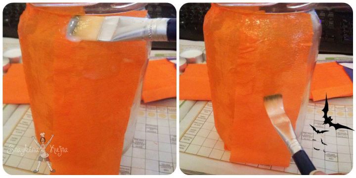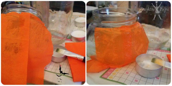 Četkicom premažite u tankom sloju polovinu tegle, pa lepite trake krep papira tako da se malo preklapaju, ako se papir gužva i nije potpuno ravan nema veze super izgleda kad se osuši.