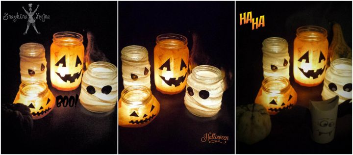 Kad su tegle potpuno suve isecite od crnog kolaž paipira oči, usta i nos u obliku koji želite zalepite oho lepkom za teglu, ubacite svećicu i uživajte!